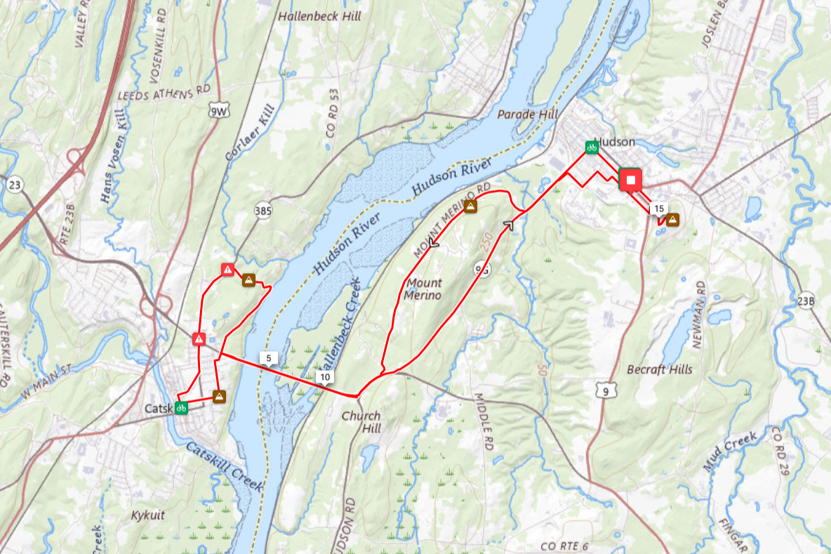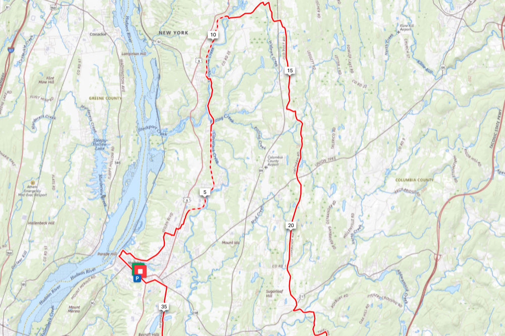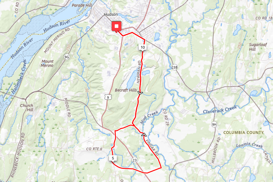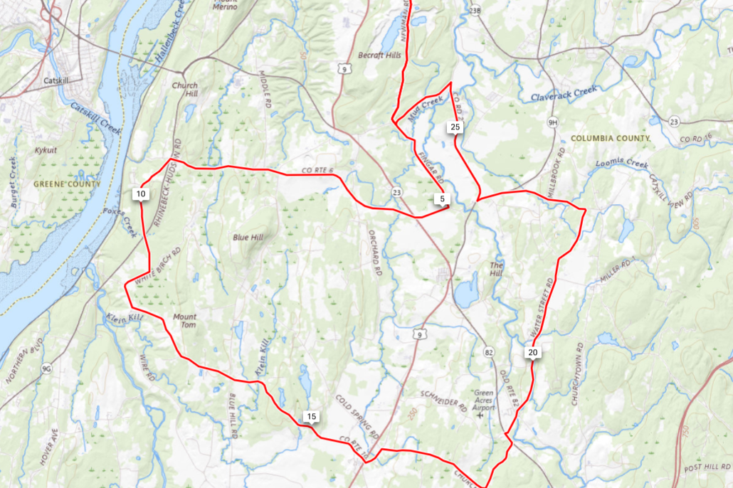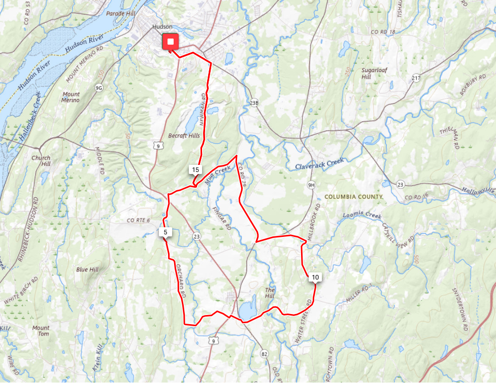 Leaving Hudson to the North on the Albany-Hudson Electric Trail, a rail trail that's part of the Empire State Trail. At Stuyvesant Falls the route departs from the rail trail and takes you back South on very rural farmland roads. It's all quite flat EXCEPT for that one 400ft hill in Philmont.